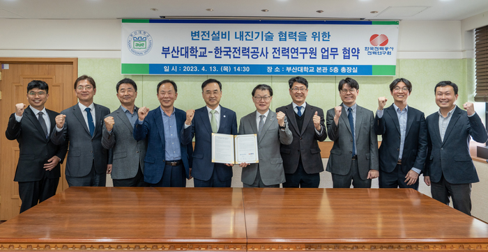 부산대학교(총장 차정인)는 국내 지진분야 최고 실험기관인 부산대 지진방재연구센터와 한국전력공사 전력연구원(원장 이중호)이 국가 변전 핵심설비 실규모 내진검증 시험기술 고도화를 위한 「변전설비 내진기술 협력 업무협약」을 지난 13일 교내 대학본부 5층 총장실에서 체결했다고 17일 밝혔다.