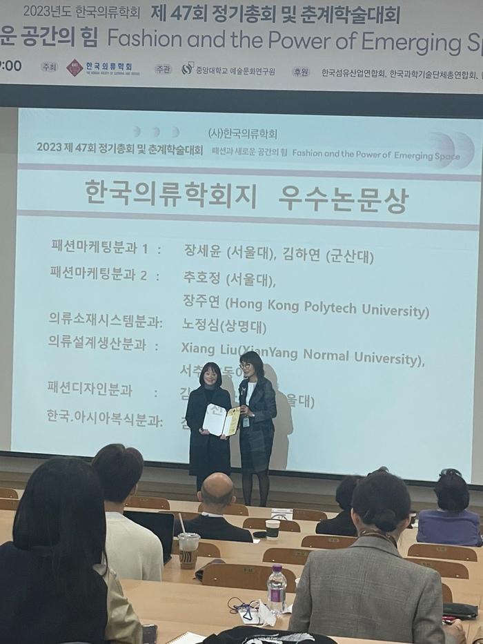 ▲ 서추연(왼쪽) 교수가 2023년 한국의류학회 춘계학술대회에서 우수논문상을 수상했다. © 김중건