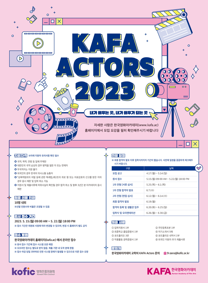 한편, 올해 개교 40년을 맞은 KAFA에서는 최초로 연기 전공을 신설해 본격적인 신인 배우 발굴에 나섰다. ‘KAFA Actors’ 에서는 제작워크숍, 연기 실습, 작품분석, 개인레슨, 캡스톤 디자인 등의 교육과정이 제공된다. KAFA의 정규·장편과정과 연계한 현장 위주의 실무 수업을 통해 졸업 즉시 영화 현장에서 핵심 인력으로 활약할 수 있을 전망이다. 원서 접수는 5월 15일부터 22일까지고 총 10명 내외를 선발할 예정이며, 자세한 사항은 KAFA 홈페이지에서 확인할 수 있다.