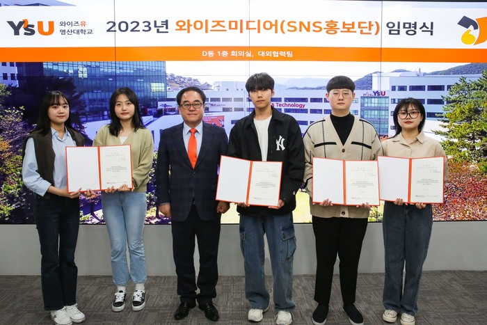 와이즈유 영산대학교(총장 부구욱) 대외협력팀이 21일 오전 10시 부산시 해운대구 반송동 대학 해운대캠퍼스 D동 대회의실에서 재학생 7명으로 구성된 ‘2023 SNS홍보단’ 임명식을 진행했다.