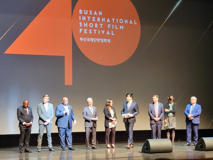 제40회 부산국제단편영화제가 25일 오후 7시 부산시 해운대구 영화의전당 하늘연 극장에서 개막했다. '영화와 유산' 이라는 올해 영화제 주제로 열린 이날 개막식에는 박형준 부산시장과 부산시의회 의원, 주한 부산 미국 영사관 영사 놀란 바크하우스, 쥬느비에브 롤랑 한국프랑코포니 진흥위원회 의장, 주한 퀘벡정부 대표부 대표, . 프랑수아 봉땅 주한 벨기에 대사. 알루 완유 외젠 비티 주한 코트디부아르 대사, 요안나 도너바르트 주한 네덜란드 대사, 빌류스 사무일라 주한 리투아니아 대사관 공관 차석, 다니엘 리뇨 주한 프랑스 대사관 불어교육협력담당관 등 8 명의 외교 사절이 참석했다.