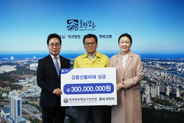 세계평화통일가정연합 한학자 총재가 강릉시 산불 피해 지역의 이재민을 지원하기 위한 성금 3억원을 27일 강릉시에 전달했다.
