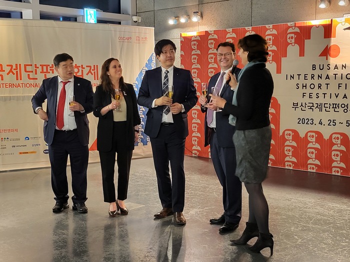 ▲ 제40회 부산국제단편영화제 개막식 후 리셉션 장에서 미국 부산영사(왼쪽에서 4번째) 등 외교사절과 담소를 하고 있는 치민철 (사)부산국제단편영화제 이사장(왼쪽에서 세번째) ©김중건