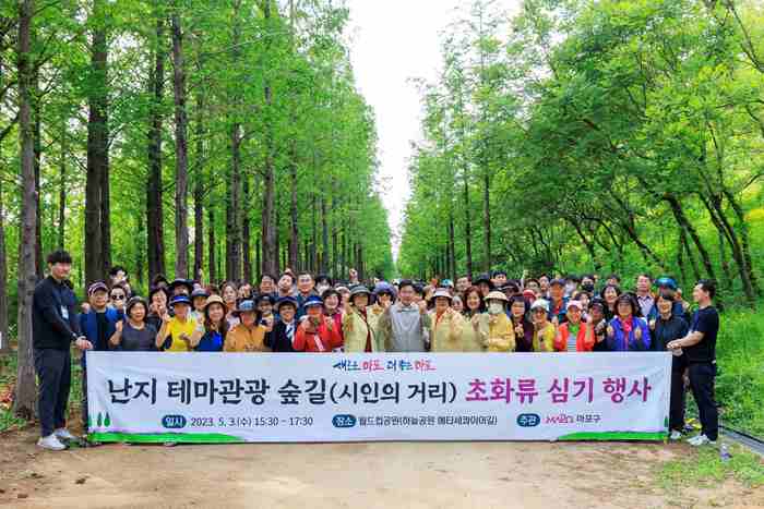 마포구, 난지도에 테마숲길 조성하여 새 명소 만든다.- 하늘공원 메타세콰이어길 1㎞에 50만여 꽃무릇 등 특화거리 계획마포구가 3일 오후 월드컵공원의 하늘공원 메타세콰이어길에서 200여명의 주민, 직원들과 함께 석산(꽃무릇)을 비롯한 2만 6천여 본의 초화류를 심었다.