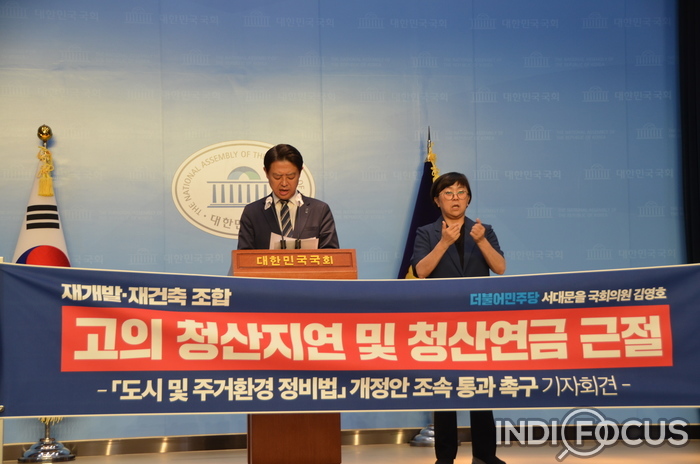 김영호, 일명 '청산연금방지법' 조속한 논의 및 통과, 시행 촉구- 재건축, 재개발 정비조합 청산 고의 지연하며, 부당 월급 챙기는 이른바 ‘청산연금’ 근절법더불어민주당 서울시당위원장 김영호 의원(서대문을)은 31일(수) 오후 2시 20분 국회소통관에서 기자회견을 열고 “재개발, 재건축 조합의 이른바 ‘청산연금’ 문제를 국민 여러분께 소상히 알리고, 그 문제 해결을 위한 입법 내용과 추진 의지를 밝히고자 이 자리에 섰다.”고 말했다.