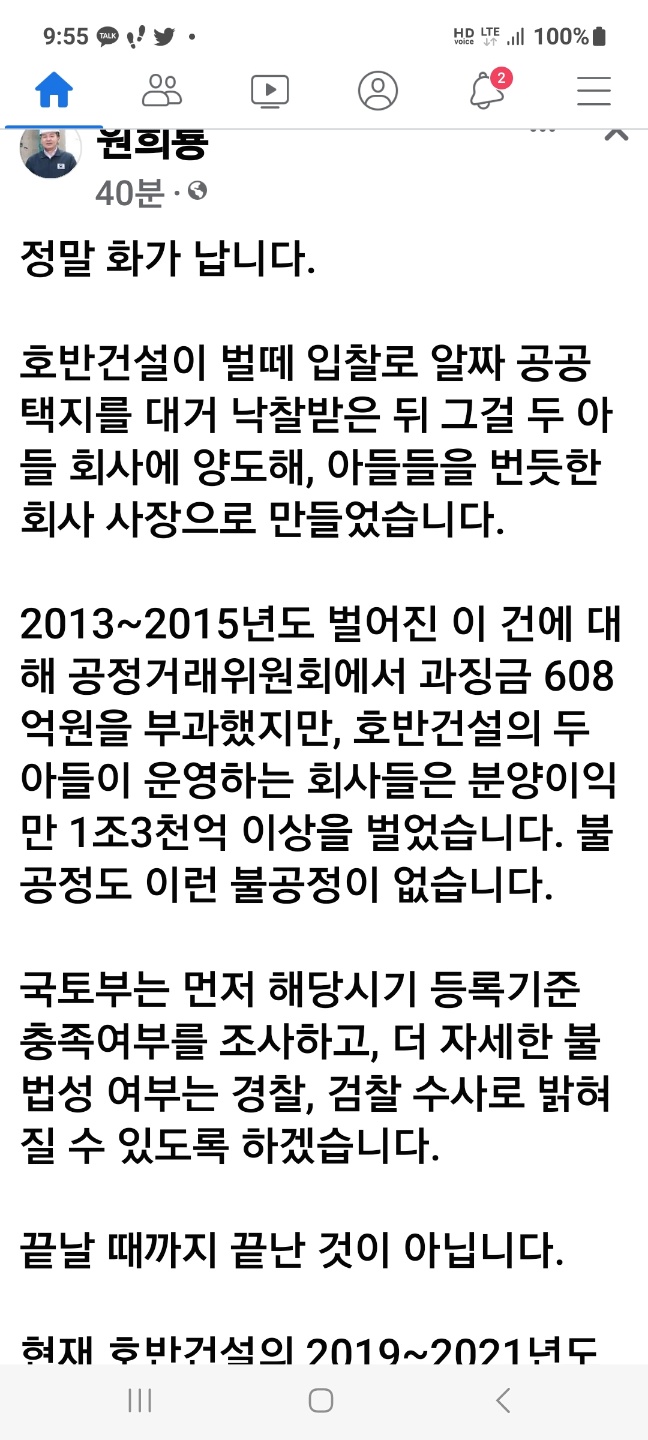 그러면서 “2013~2015년도 벌어진 이 건에 대해 공정거래위원회에서 과징금 608억원을 부과했지만, 호반건설의 두 아들이 운영하는 회사들은 분양이익만 1조3천억 이상을 벌었습니다. 불공정도 이런 불공정이 없습니다”라고 꼬집었다.
