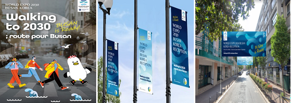 아울러, 런던 시티투어 2층 버스 5대, 파리 택시 150대, 브뤼셀 트램 12대를 랩핑해 각국 국제박람회기구 대사관이 집중 위치한 지역을 대상으로 적극 홍보하며, 파리 지하철·편의점·시내몰·도로 광고판과 드골공항·피카딜리광장 전광판 등을 통해서도 2030부산세계박람회 유치를 홍보한다.