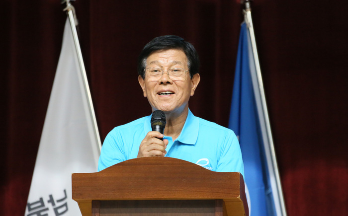 ![]() ▲ 송광석 남북통일운동국민연합 중앙회장이 격려사를 하고 있다 © 김중건 |