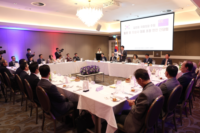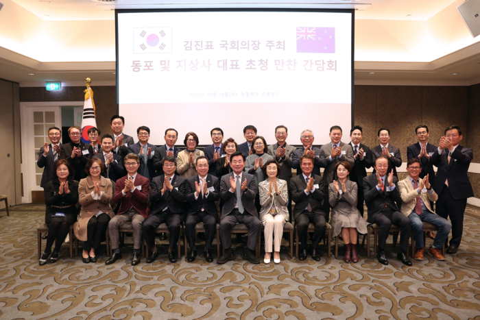 뉴질랜드를 공식 방문 중인 김진표 의장은 28일 오후(현지시간) 오클랜드 코디스호텔에서 뉴질랜드 동포 및 지상사 대표들을 초청해 간담회를 열고 교민들 건의·애로사항을 청취했다.