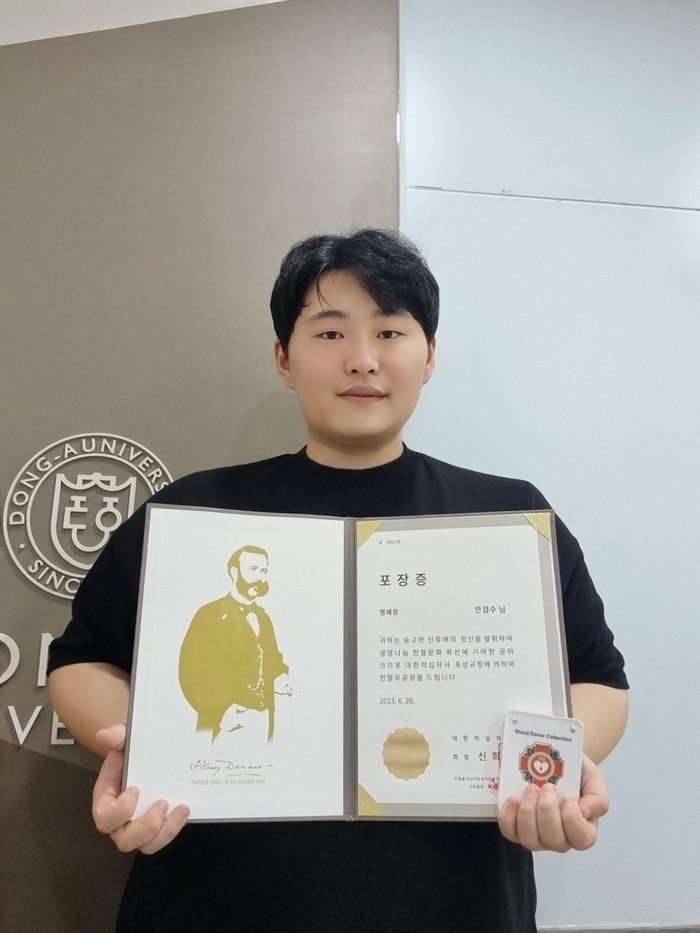 동아대학교(총장 이해우)는 전자공학과 4학년에 재학 중인 안검수(25) 학생이 헌혈 100회를 달성, 대한적십자사에서 수여하는 ‘명예장’을 받았다고 3일 밝혔다.