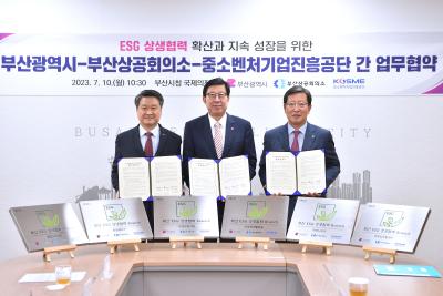 부산시(시장 박형준)는 10일 오전 10시 30분, 시청 국제의전실에서 부산시, 부산상공회의소(회장 장인화, 이하 부산상의), 중소벤처기업진흥공단(원장 김학도, 이하 중진공)과 「환경․사회․투명 경영(ESG) 상생협력 확산과 지속 성장을 위한 업무협약」을 체결했다.