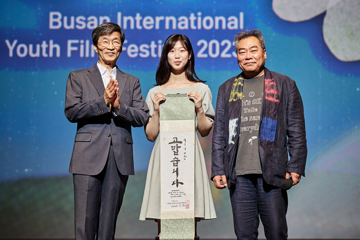 ▲ 10살때부터 비키 개폐막식 사회자로 활약해 오면서 성년이 된 사회자 이지원 배우에게 김상화 비키 집행위원장이 감사의 뜻을 담은 글을 전달했다. (왼쪽부터) 곽노현 이사장, 이지원 배우, 김상화 집행위원장 © 김중건