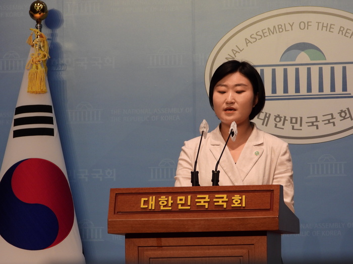 ▲ 기본소득당 신지혜 대변인이 7월 11일 오전 국회에서 KBS 수신료 분리징수 중단을 촉구하는 기자회견을 하고 있다. © 인디포커스