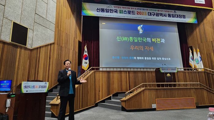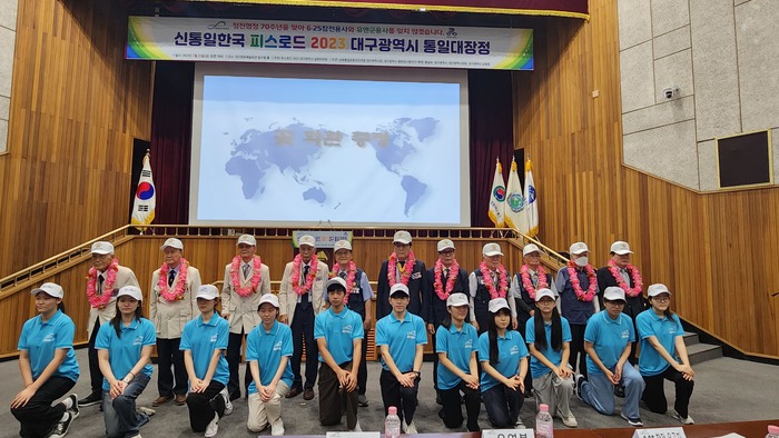 2023피스로드 통일 대장정 대구광역시 출정식 "피스로드 운동은 통일. 연결 운동"21일 대구문화예술회관에서 300명 여명 참가, DMZ로 향한 힘찬 출발.정전협정 70주년을 맞아 6·25전쟁 참전 22개국 병사들의 희생을 추모하고 통일 공감대 확산을 위한 ‘One Korea 피스로드 2023 대구광역시 통일 대장정’이 21일 오전 10시 대구문화예술회관 달구벌에서 300여 명이 참석한 가운데 개최됐다.