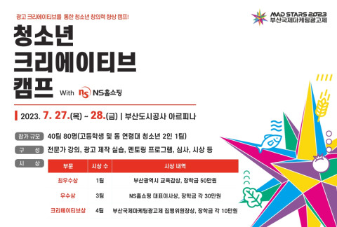 부산광역시교육청과 부산국제마케팅광고제가 공동 주최하고 NS홈쇼핑이 후원하는 ‘2023 크리에이티브 캠프(이하 캠프)’는 국내 청소년의 마케팅·광고·디지털 콘텐츠 분야의 창의력을 향상시키고자 2014년부터 매년 개최, 올해 10주년을 맞이하는 교육 및 경진 프로그램이다.