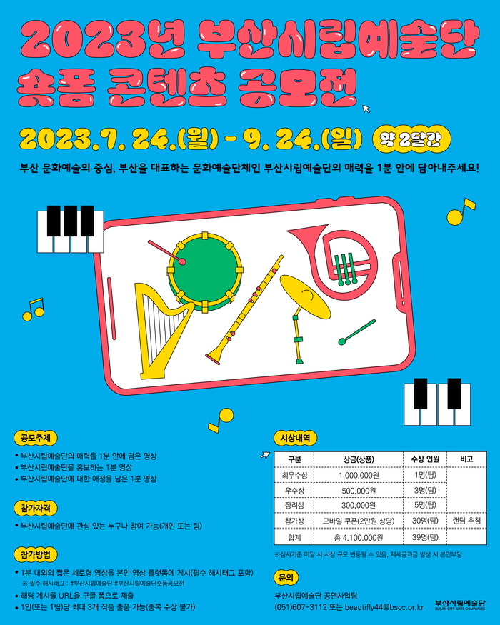 이번 숏폼 콘텐츠 공모전은 2030 관객들의 취향과 미디어 트렌드에 맞는 숏폼 콘텐츠 제작을 통해 부산시립예술단의 친근한 이미지를 대내외에 알리기 위한 작업으로, 부산시립예술단 7개 단체의 공연을 소재로 한 영상을 바탕으로 예술단 공연의 매력을 전하는 1분 이내의 영상을 모집해 심사한다.