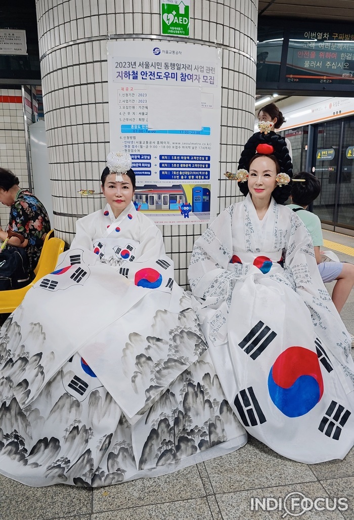 코리아한복입고놀자 이다연 회장은 "정명희 모델과 함께 지난 15일 제 78주년 광복절을 맞아 태극기 한복 버스킹을 차돌스튜디오 대표. 민경보 사진 작가. 조용경 영상 편집 후원으로 경복궁에서 펼쳤다"라고 17일 밝혔다.