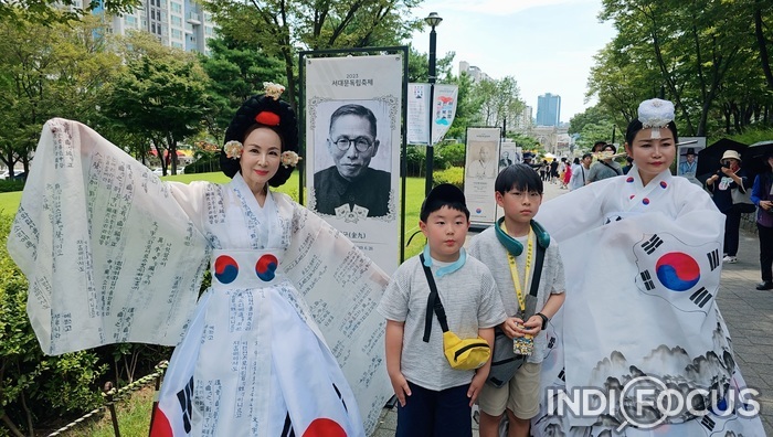이날 내.외국인들에게 광복절에 의미를 담아 우리한복을 알리는데 무더위도 참아가며 겹겹이 입은 태극기 한복을 알렸다.