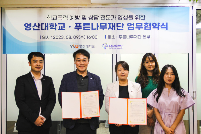이번 협약에는 영산대 경찰행정학과 심혜인 교수, 푸른나무재단 이종익 사무총장, 유범열 과장 등이 참석했다.