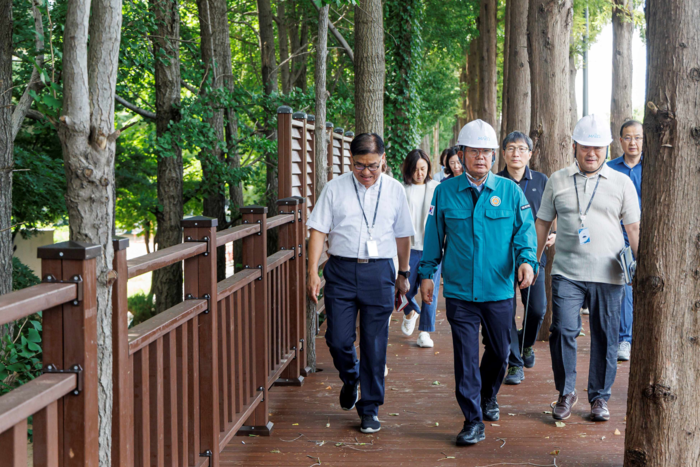 ▲ 7일 월드컵 메타세쿼이아길 보행로 공사 현장을 점검하는 박강수 구청장/사진=마포구 © 인디포커스