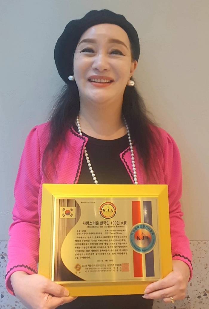 제나 정(Zena Chung) 한국-인도 비즈니스센터 (Indo-Korea Business Center) 회장이 지난16일 백범 김구 기념관에서 열린 ‘2023 자랑스러운 한국인100인 대상’ 대한민국 문화 예술의 우수성을 국내외에 널리 알리는데 기여한 공로로 문화 부문에서 대상을 수상했다고 밝혔다.