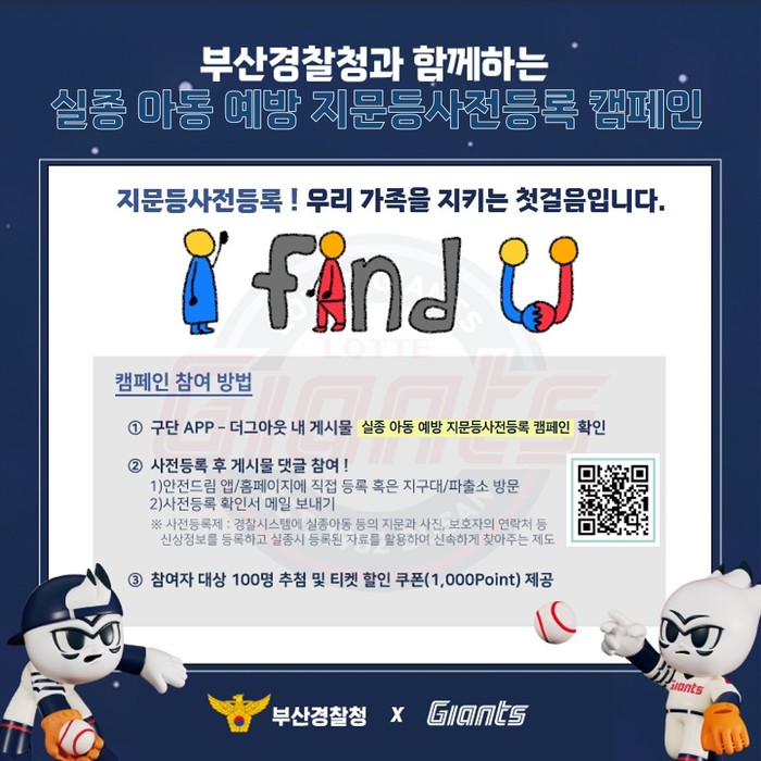 또한, 부산경찰청에서 제작한 실종예방 슬로건 ‘(I FIND U)’ 및 ‘안전드림 앱 QR코드’가 삽입된 실종예방 종이팔찌를 야구장 곳곳에 비치하여 적극적인 홍보를 이어갈 예정이다.