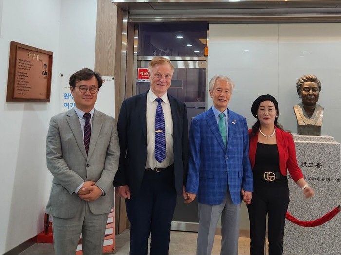 ▲ 왼쪽부터 김성훈 부산외대 특임교수, 헤이키 란타 주한 핀란드 상의 회장, 부구욱 영산대 총장, 제나 정 글로벌외교관포럼 회장 © 김중건