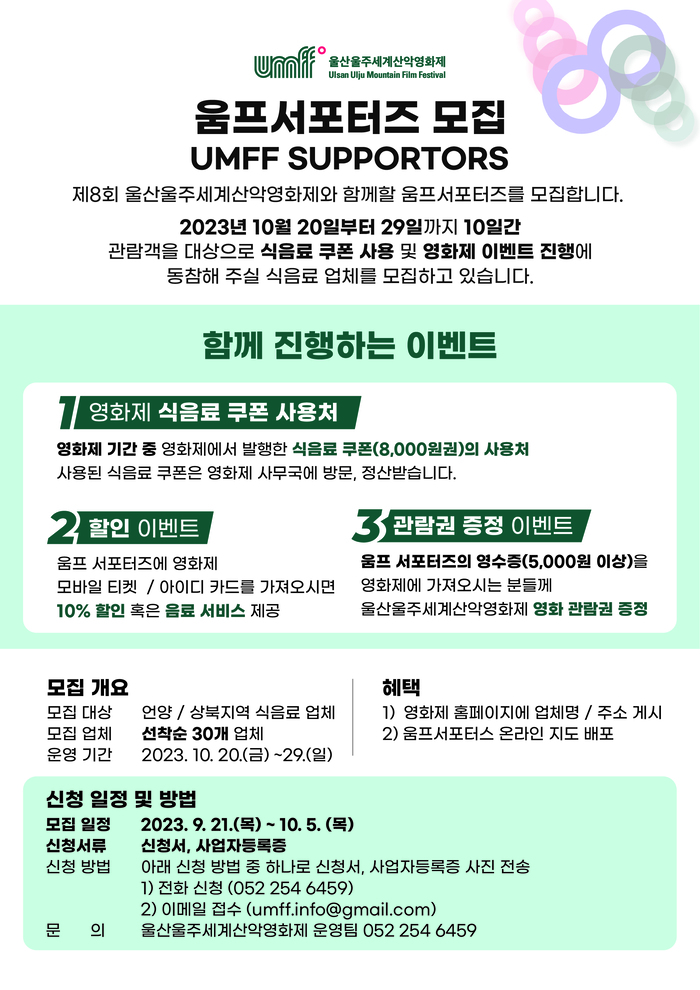 울산울주세계산악영화제가 오는 9월 27일까지 8회 영화제를 함께 할 울산, 울주지역의 움프 서포터스 30개 업소를 선착순 모집한다.