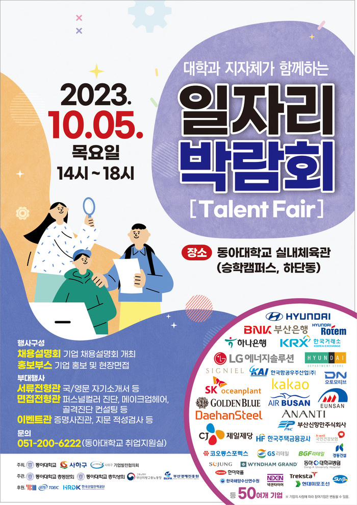 부산지방고용노동청·부산경제진흥원·동아대 총동문회(회장 신정택 세운철강 회장)·동아대 총학생회(회장 강기동) 주관, 한국토익위원회 후원의 이번 행사는 동아대 승학캠퍼스 실내체육관에서 이날 오후 2시부터 6시까지 열린다.