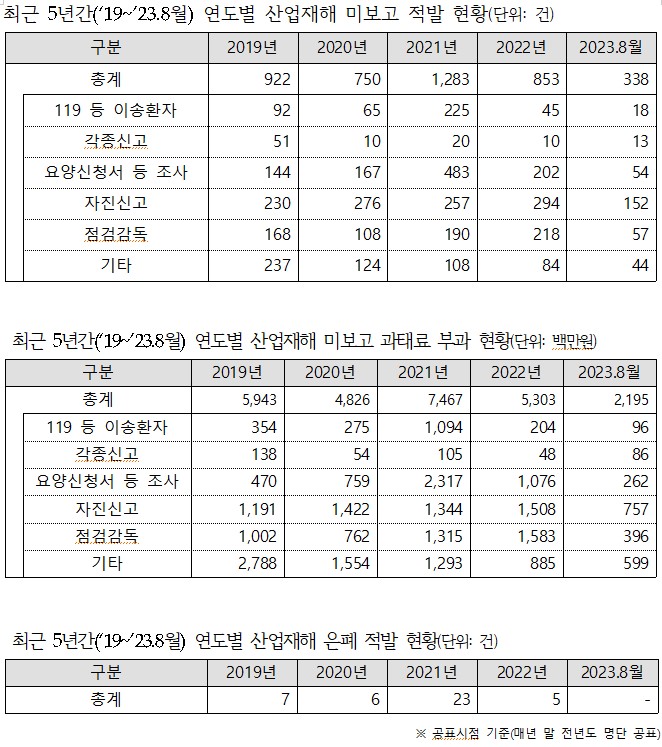 산업재해가 발생했음에도 불구하고 신고하지 않은 사례는 △2019년 922건, △2020년 750건, △2021년 1,283건, △2022년 853건, △2023.8월 338건으로 매년 700건 이상 발생했다. 고용노동부가 건강보험공단과 연계해 적발이 증가한 2021년을 제외하면 비슷한 추이로 나타나고 있으며, 숨겨진 사고까지 더할 경우 전체 미보고 건수는 더 늘어날 것으로 보인다.