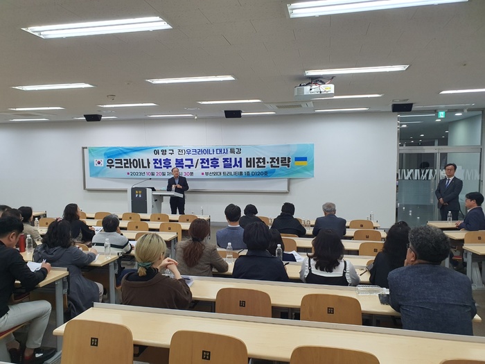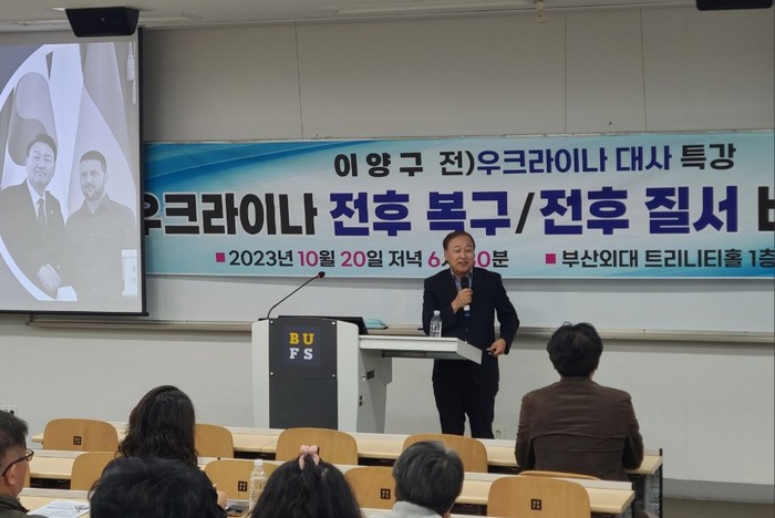 부산외국어대학교 K-컬처 글로벌연구소(소장 류영철 글로벌미래융학부장)는 지난 20일 오후 6시 부산시 금정구 부산외대 트리니티홀에서 ‘우크라이나 전후 복구 전후 질서 비전과 전력’을 주제로 한국우크라이나뉴빌딩협회 이양구 회장(전 우크라이나대사) 초청 전문가 특강을 했다고 23일 밝혔다.