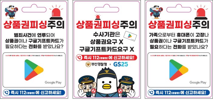 이번 업무협약에 따라 부산지역 GS25 940개 매장 내 구글기프트카드 판매대에는 구매 고객이 주의할 수 있도록 관련 안내문을 부착하고, 일부 매장에는 부산경찰청에서 제공하는 피싱 범죄 예방 영상을 송출해 피해를 줄일 예정입니다.