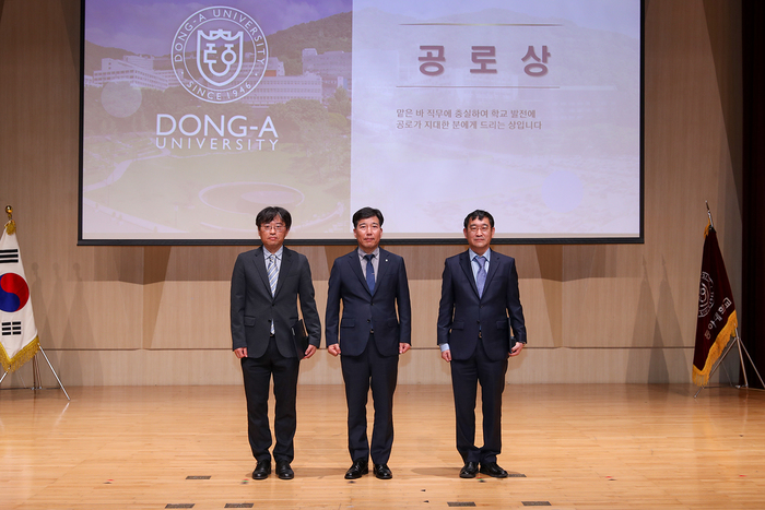 ▲ ‘자랑스러운 동아인상’ 수상자들이 이해우 총장과 기념촬영을 하고 있다. 왼쪽부터 신한춘 부산광역시화물자동차운송사업협회 이사장, 이해우 총장, 한호종 유카로오토모빌(주) 회장. © 김중건