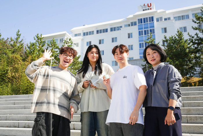 ▲ 왼쪽부터 패션브랜드 '마사초이' 론칭을 준비 중인 와이즈유 영산대학교 패션디자인학과 박우진, 최혜경, 류은우 학생, 김지형 교수. © 김중건