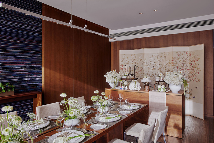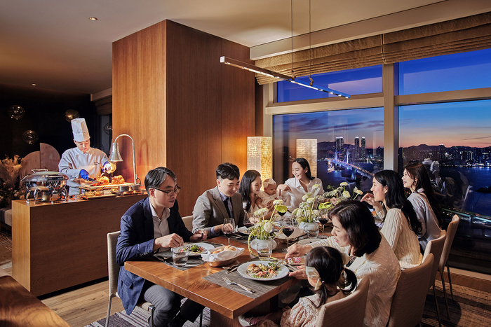 먼저, 객실에 들어서면 가장 먼저 보이는 거실에는 카나페와 와인을 즐길 수 있는 웰컴 리셉션이 마련되어 있어 초대한 손님을 기분 좋게 맞이할 수 있다. 베뉴를 더 풍성하게 채우고 싶다면, 포토 테이블, 플라워 데커레이션, 풍선 등으로 꾸며지는 포토존을 추가할 수 있다. 최대 10명이 식사할 수 있는 테이블을 갖추고 있는 다이닝 공간에는 고객의 취향을 반영한 고급스러운 돌상이 세팅되며, 테이블에는 돌상과 어울리는 생화 장식이 더해져 한층 화사한 분위기를 연출한다. 식사 메뉴는 ‘마이 프라이빗 셰프(My Private Chef)’ 콘셉트의 양식 4코스이며, 메인 요리인 스테이크는 호텔 셰프가 직접 썰어 제공하는 카빙 테이블(Carving Table)에서 준비되어 더욱 특별하다. 침실에는 드레스룸이 있어 메이크업, 환복 등을 위한 장소로 활용하기 좋으며, 바다를 마주하고 있는 욕실이 이어져있어 행사를 마친 후 편안한 호캉스까지 만끽할 수 있다.