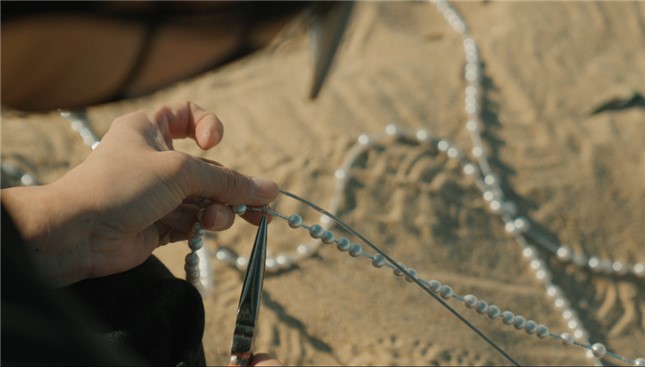 지역의 이야기는 진주와 비즈를 엮은 그물의 형태로 관람객들을 만나기도 한다. 김덕희 작가의 <메아리, 바다 가득히>가 그것. 가로, 세로 8미터, 높이 4미터에 달하는 이번 출품작은 이제는 만날 수 없는 소중한 누군가를 향해 쓰인 메시지이다. 둥글고 빛나는 진주와 길쭉한 비즈를 모스 부호로 공모를 통해 수집한 사연들을 엮어내었다. 이야기들은 이제는 만날 수 없는 소중한 누군가를 향해 쓰인 메시지로, 섬세한 가닥 안에 얽혀 바다가 많은 사람에게 어려움과 위태로움의 공간임을 기억하게 한다.