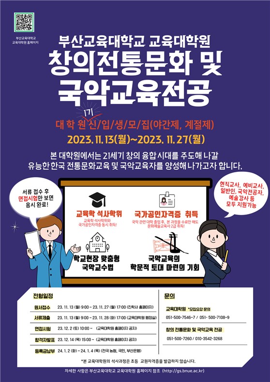 부산교육대학교 교육대학원은 21세기 창의융합 시대를 주도해 나갈 유능한 한국전통문화교육 및 국악교육자를 양성해 나가고자 대학원 제1기 신입생을 모집하고, 전형은 서류 접수 후 면접만으로 진행한다.