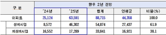 서울시가 정비사업 아파트 입주 예정물량에 재개발, 재건축, 소규모주택정비 등을 포함, 비정비사업 입주예정물량과 청년안심주택, 공공주택, 역세권장기전세주택 등으로 구분하여 분양공고 및 건축인허가 자료를 토대로 25개 자치구의 사업별 진행현황을 재산정 조사 확인한 결과 23.11월 기준 `24년 2만5천호, `25년 6만4천호가 입주할 것으로 전망되었다.