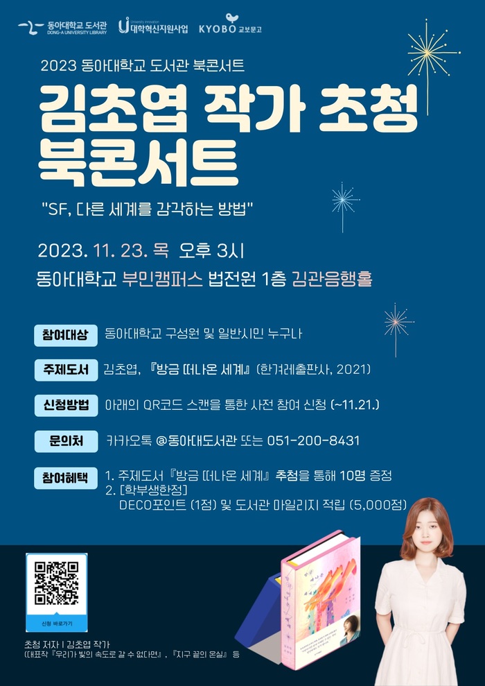 동아대학교 학술정보원(원장 이정관) 도서관은 한국 문학의 ‘팬덤’ 문화를 이끌고 있는 김초엽 작가를 초청한 가운데 ‘2023 도서관 북 콘서트’를 갖는다고 15일 밝혔다.