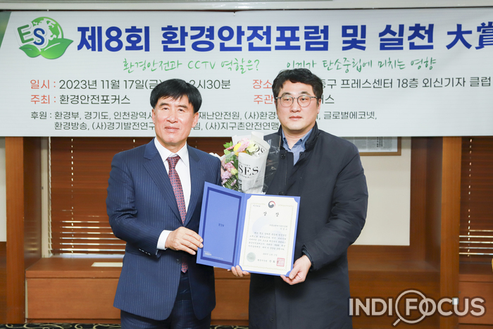 17일 오후 한국프레스센터에서 제 8회 환경안전포럼 및 실천대상에서 '(주)중소벤처기업인증원 이성우'(사진/오른쪽)가 esg경영인증 활동에 대한 활동의 공로를 인정받아 환경부장관장상을 받았다. 이날 방덕우 대회장(사진/왼쪽)이 환경부장관을 대신 상장을 수여했다. 사진/모동신 기자 © 인디포커스