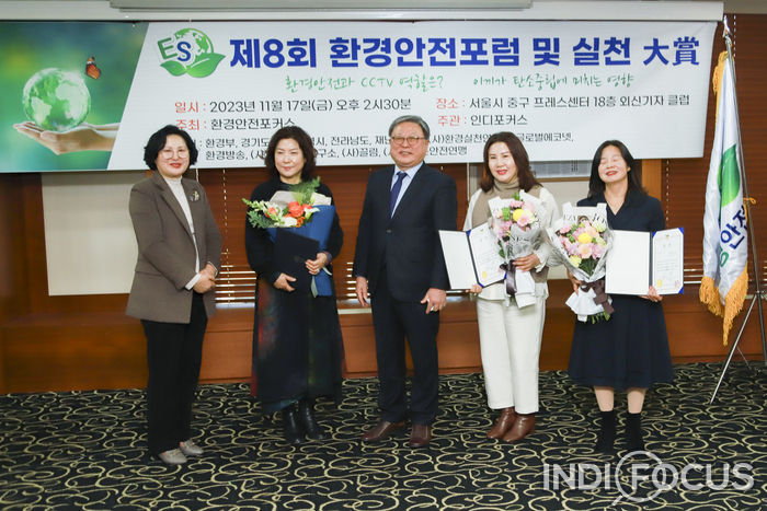 .17일 오후 한국프레스센터에서 제 8회 환경안전포럼 및 실천대상에서 경기도지사상을 수여받은 수상자들과 환경안전포커스 김은해 발행인(완쪽 두번째) 정근호, (가운데)경기도지사를 대신해 신복용 인디포커스 상임고문 신복용가 수여했다. (오른쪽 두번째) 표민우, (오른쪽)홍준호가 기념사진을 촬영하고 있다. 사진/모동신 기자. © 인디포커스