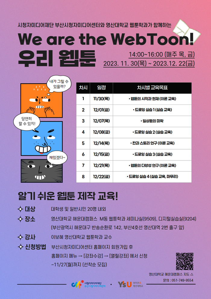 이 교육은 웹툰의 시작과 현재, 드로잉실습, 일상툰의 미학, 칸과 스토리 연구 등 총 8회차 수업으로 진행되며 수강료는 무료다. 교육은 30일부터 매주 목‧금요일 오후 2시부터 4시까지 영산대 해운대캠퍼스 M동 웹툰학과 세미나실과 디지털실습실 등에서 진행된다.