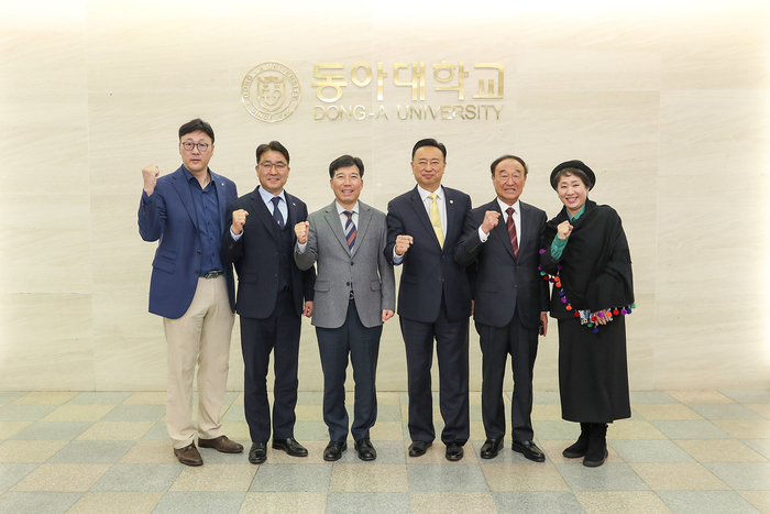 ▲ 이해우(왼쪽에서 세 번째) 동아대 총장과 이진(왼쪽에서 네 번째) 미국 시카고 메인타운십 교육위원, 김창석 부산시의원(왼쪽에서 두 번째) 등 관계자들이 기념촬영을 하고 있다. © 김중건
