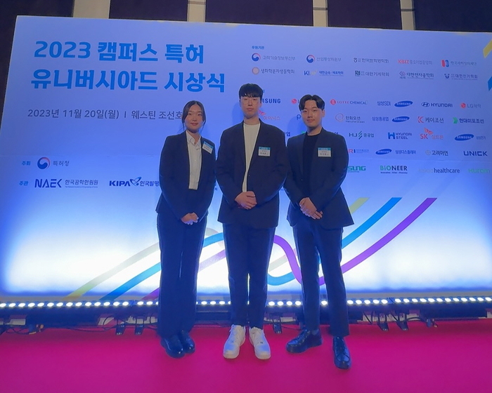 ▲ ‘2023 캠퍼스 특허 유니버시아드’ 우수상을 받은 (왼쪽부터) 정민아, 박제윤, 박지환 학생. © 김중건