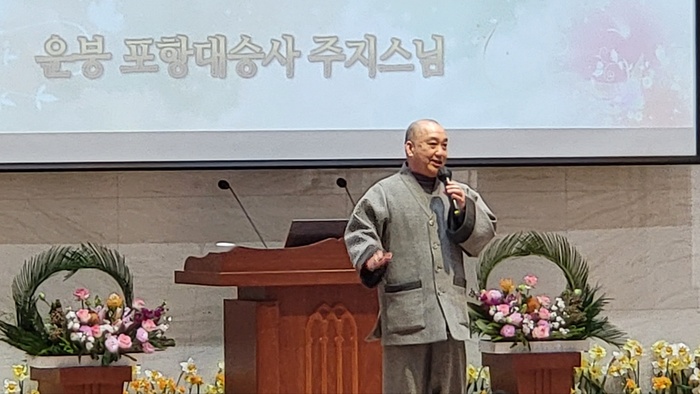 ▲ 포항 대승사 운붕스님이 자작곡인 '여보소'를 부르고 있다 © 김중건