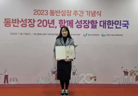 ▲ 서울 마포구 에스플렉스센터에서 개최된 ‘2023년 동반성장 주간 기념식’에서 원지혜 코이카 동반성장팀장이 중소벤처기업부 장관 표창장을 들고 기념촬영을 하고 있다 © 김중건