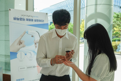 ▲ 2021년 10월 경기도 성남시 코이카 본부에서 개최된 ‘중소기업 판로 지원 및 우수 협력업체 발굴을 위한 구매 상담회’에서 코이카 협력 중소기업 라메디텍 직원이 레이저 채혈기를 홍보차 시연하고 있다 © 김중건