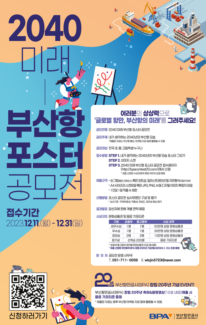 부산항만공사(BPA, 사장 강준석)가 12월 11일(월)부터 31일까지 20일 간, 부산항에 대한 학생들의 관심을 높이고 다가오는 창립 20주년을 기념하고자 ‘2040 미래 부산항 포스터 공모전’을 개최한다.