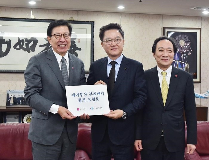 이날 오후 1시 40분 박형준 부산시장, 안성민 부산시의회 의장, 부산상공회의소 장인화 회장 등이 부산상공회의소 접견실에서 강석훈 산업은행 회장에게 이러한 내용을 담은 에어부산 분리매각 협조 요청문을 전달했다.