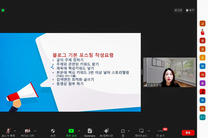 이번 교육은 SNS 마케팅, 블로그 마케팅을 위한 카드뉴스 제작, 인스타그램 마케팅, 셀프 마케팅, 관심업종 팔로우 등의 내용으로 나흘간 총 12시간 비대면으로 진행됐다.